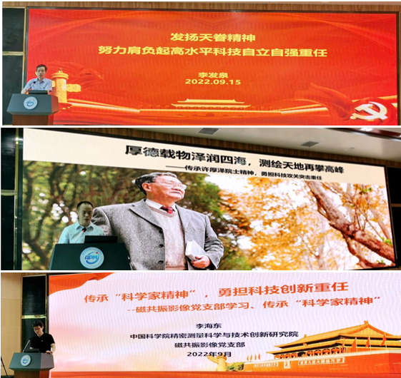 在传承弘扬科学家精神专题报告会上,王天眷大气探测激光雷达技术攻关与台站建设突击队负责人李发泉作《发扬天眷精神,努力肩负起高水平科技自立自强重任》专题报告。大海洋大地测量与水下导航科技攻关临时团支部书记武凛作《厚德载物润泽四海,测绘天地再攀高峰——传承许厚泽院士精神,勇担科技攻关突击重任》专题报告。磁共振影像研究部副主任、团支部委员李海东作《传承科学家精神,勇担科技创新重任》专题报告。