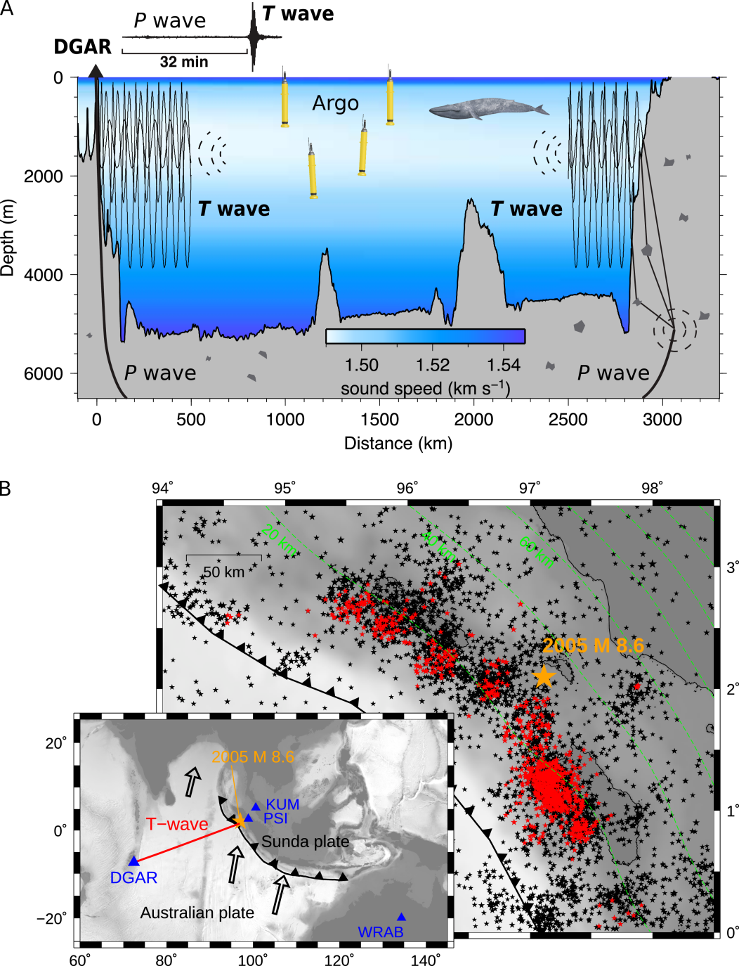 图1,地震T波传播路径示意图