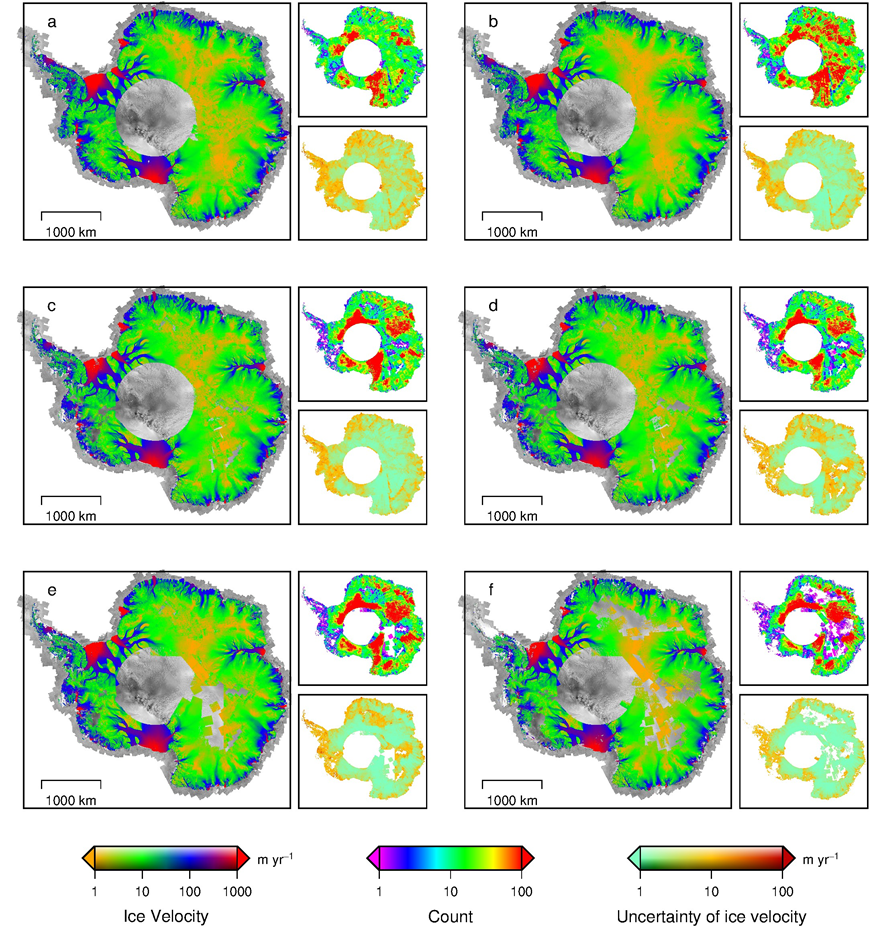 (a-f 对应2013-2019年的年度冰流速,每个年度冰流速图附带影像数量图(上)和不确定性图(下))
