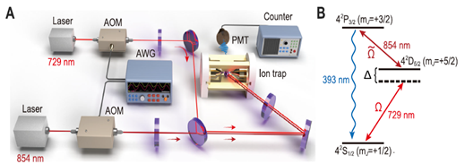 (A)实验平台示意图,单个40Ca+离子在激光的精准操控下展现奥托热机的量子特性。(B)40Ca+离子的能级示意图
