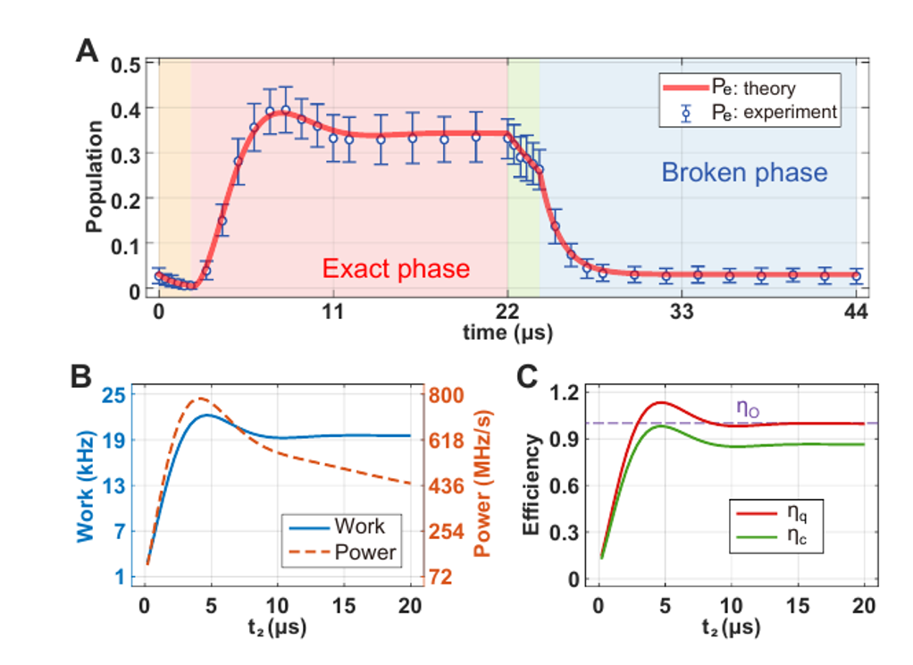 (A)测量得到的激发态布居数随时间的变化,橘色、粉红色、绿色、蓝色区域分别代表绝热压缩、等容加热、绝热膨胀和等容冷却等四个冲程。处于严格相的等容加热冲程呈现出明显的布居数振荡(B)量子奥托热机的功和功率随时间的变化(C)量子奥托热机的效率随时间的变化,其中红线和绿线分别对应量子热机和传统热机