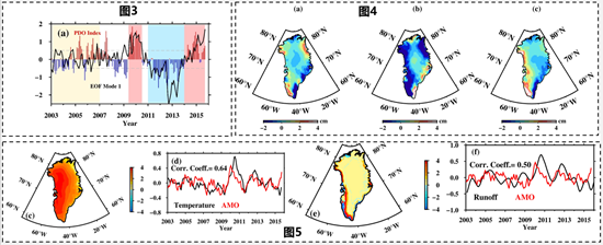 合作团队基于GRACE重力卫星近二十年的观测,结合区域气候模型以及气象再分析资料,利用经验正交函数(EOF)以及复经验正交函数(CEOF),深入研究了两极冰盖质量在年际尺度上的变化特征及其对不同气候涛动因子的响应。研究表明,受ENSO的影响,东西南极冰盖存在反相变化的偶极子现象(图1),并且南极冰盖年际质量变化与南极涛动(AAO)密切相关;同时南极冰盖质量异常在空间上会发生传播(图2),东南极存在周期约为4.7 年的东向行波,其形成与南极绕极波(ACW)有关;西南极则存在周期约为2年的西向行波,其形成可能与AAO驱动的地表温度异常有关。同时,还分析了格陵兰冰盖对不同气候因子的响应。格陵兰冰盖在年际尺度上的质量变化与太平洋年代际震荡(PDO)密切相关,PDO顺利获得影响冰岛低气压进而影响了格陵兰地区的气候要素变化(图3);受北大西洋涛动(NAO)导致的降水异常影响,东格陵兰与西格陵兰冰盖呈现相反的变化特征(图4);大西洋年代际震荡(AMO)对格陵兰冰盖也有着重要的影响,AMO主要影响了格陵兰地表温度和径流的变化(图5)。