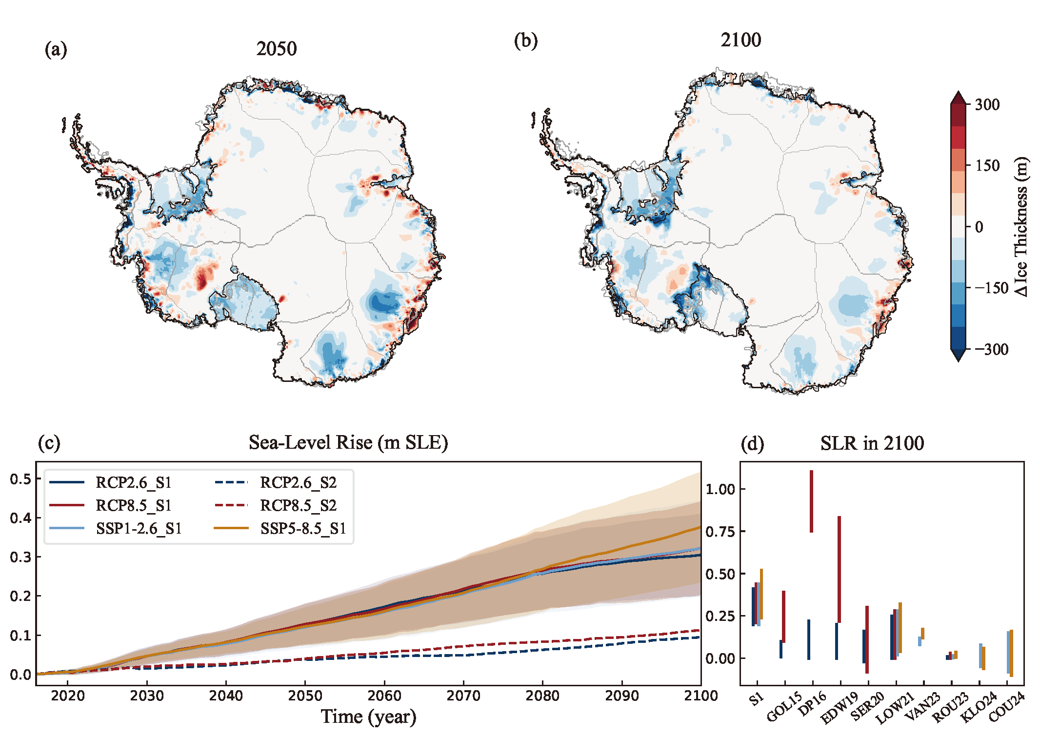 冰盖厚度差异及南极冰盖对海平面上升的贡献预测;2050年(a)与2100年(b)S1与S2多情景(RCP 2.6与RCP 8.5)预测的冰厚度空间差异平均值;(c)“SGO情景”至“SGF情景”在四种情景下的海平面上升预测范围及均值;(d)S1实验至2100年的海平面贡献与其他研究的对比