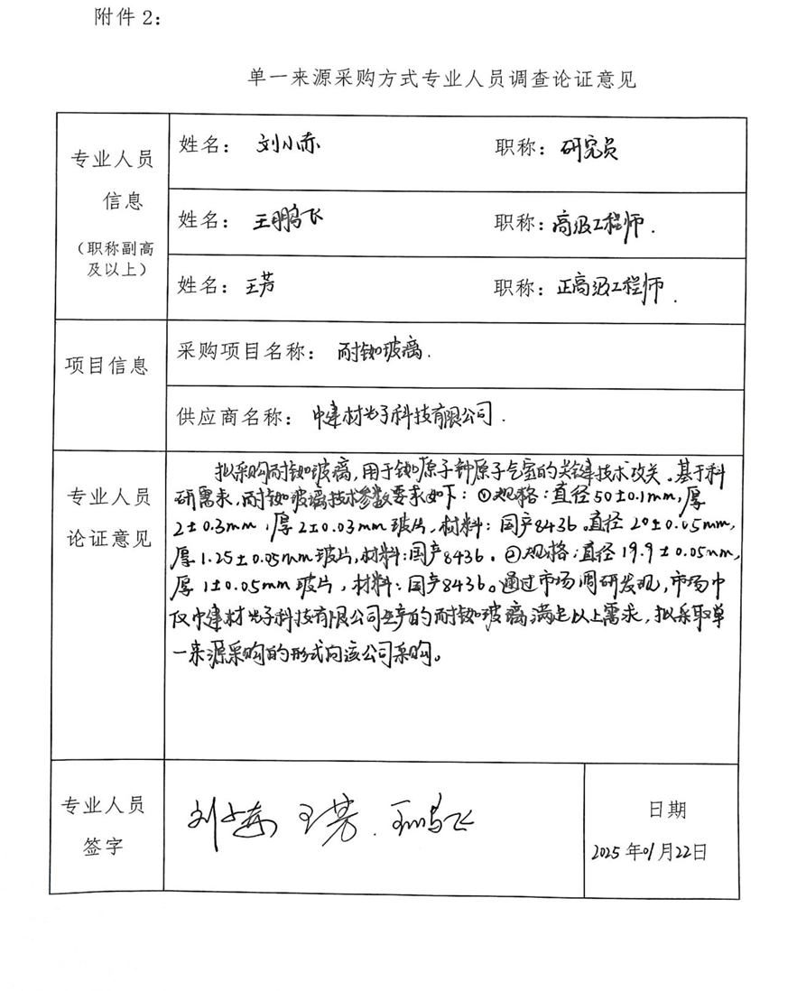 基于科研需求,耐铷玻璃技术参数要求如下。规格:直径50±0.1mm mm、厚2±0.03mm mm玻片,材料:国产8436。直径20±0.05mm、厚1.25±0.05mm玻片,材料:国产8436。规格:直径19.9±0.05mm、厚1±0.05mm玻片,材料:国产8436。顺利获得市场调研发现,市场仅中建材光子科技有限公司生产的耐铷玻璃满足以上需求,拟采取单一来源采购的形式向该公司采购。