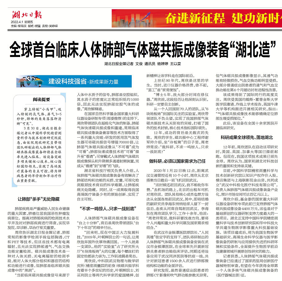 【湖北日报】让肺部“杀手”无处藏!全球首台临床人体肺部气体磁共振成像装备“湖北造”