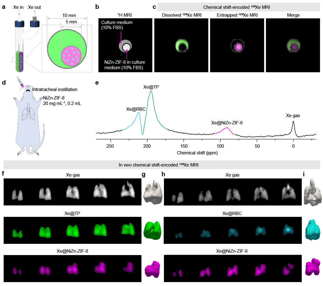周欣研究团队前期发现金属有机框架(MOF)材料ZIF-8对Xe具有较高的亲和力,可用于捕获Xe原子,进行超极化129Xe磁共振成像(PNAS,2020)。本研究中,该团队基于前期研究基础,首次将多组分MOF构建策略引入到超极化129Xe磁共振领域。顺利获得在ZIF-8骨架中引入多种金属,调节ZIF-8孔道与Xe的相互作用,有效提高水溶液中MOF笼内129Xe的信号强度。应用该策略构建的NiZn-ZIF-8孔道内信号相对于溶解态129Xe信号增强210倍以上,将其作为“彩磁”标记分子注入大鼠肺部,可取得较强的NiZn-ZIF-8“笼”内129Xe(129Xe@NiZn-ZIF-8)信号。对大鼠活体肺部四种不同化学位移的129Xe(129Xe@gas、129Xe@TP、129Xe@RBC以及129Xe@ NiZn-ZIF-8,如图1)进行编码标记,可取得四种不同化学环境的129Xe影像,且不同化学位移的129Xe信号可有效区分,互不干扰,即实现了活体多化学位移编码的“彩色”MRI。该MOF“彩磁”标记分子与荧光标记分子功能类似,后续可根据需求,对其进行功能化修饰,用于多种生物靶标的超灵敏彩色MRI。